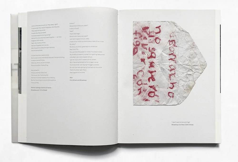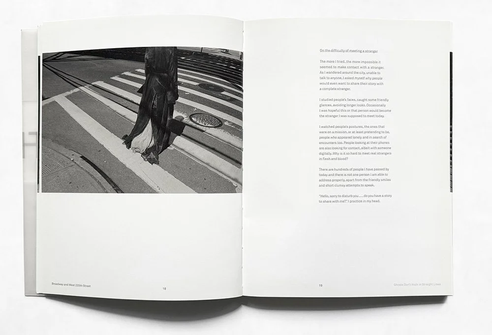Ghosts Don’t Walk in Straight Lines is a book and film collaboration with photographer and filmmaker Vincent van de Wijngaard. It follows a journey through the streets of New York City on foot from North to South Manhattan in one full day. This slow, 20-hour walk along Manhattan’s old Broadway was documented, capturing stories and encounters from the West 225th Street/Broadway Bridge down to Battery Park.